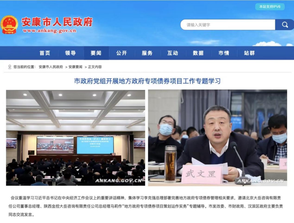2月28日,大岳咨詢董事總經(jīng)理馬莉受安康市政府邀請,就如何高質(zhì)量策劃包裝專項債券項目進行了專題輔導。武文罡市長主持會議,市政府黨組成員、市級領導,全市各部門、縣區(qū)共計500余人參加。