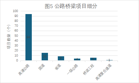 公路橋梁領(lǐng)域:高速公路為主,其次是國道、省道、一級公路等,高速公路項(xiàng)目數(shù)量占公路橋梁行業(yè)項(xiàng)目總數(shù)的比例為72.31%,具體各細(xì)分領(lǐng)域項(xiàng)目數(shù)量情況見圖5。