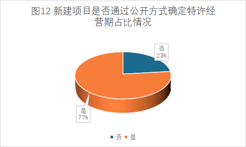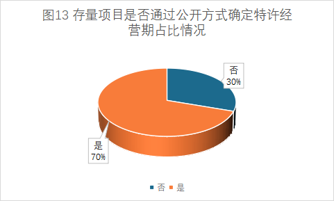 涉及新建及改擴(kuò)建的項(xiàng)目中,通過公開方式確定特許經(jīng)營期限的項(xiàng)目占比為78%;存量項(xiàng)目中,通過公開方式確定特許經(jīng)營期限的項(xiàng)目占比為60%(詳見圖12、圖13)。
