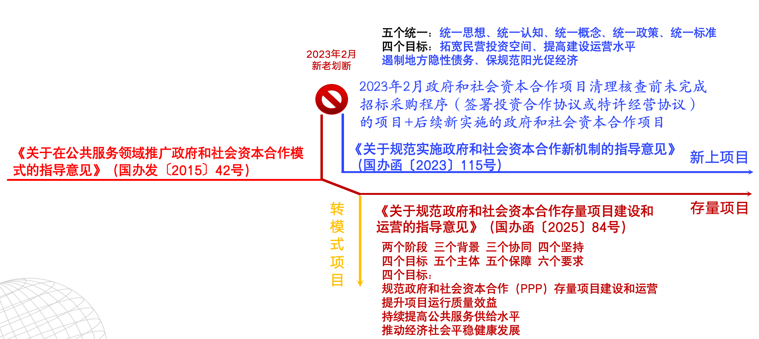 《關(guān)于規(guī)范實施政府和社會資本合作新機制的指導(dǎo)意見》(國辦函〔2023〕115號):明確2023年2月為“新老劃斷”節(jié)點,此后新上項目適用新機制。